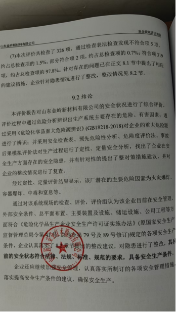 有必要公开的其它内容: 、《危险化学品生产企业安全生产许可证实施办法》(国家安全生产监督管理总局令第41号,总局令第79号及89号修订)等法律、法规、文件的规定要求,本评价组对东营金氏化工有限公司全厂安全现状评价得出结论如下: ⑴政府规划要求的符合性 东营金氏化工有限公司位于东营市垦利区郝家镇兴园路以北、阜盛路以西,公司已取得土地证,符合当地政府的规划要求。 ⑵周边的安全防火距离评价 本项目与厂外周边设施间的防火间距符合《建筑设计防火规范(2018年版)》(GB50016-2014)、《公路安全保护条例》(国务院令第593号)、《电力设施保护条例》(国务院令第239号,国务院令第588号修订)的相关要求。 根据《危险化学品生产装置和储存设施外部安全防护距离确定方法》(GB/T37243-2019)中第4章关于爆炸物、有毒气体、易燃气体的定义可知,本项目不涉及上述相关物质。根据《危险化学品生产装置和储存设施外部安全防护距离确定方法》(GB/T37243-2019)中第4.4条,本项目外部安全防护距离应满足相关标准规范的距离要求。本项目与厂外周边设施间的防火间距符合《建筑设计防火规范(2018年版)》(GB50016-2014)、《公路安全保护条例》(国务院令第593号)、《电力设施保护条例》(国务院令第239号,国务院令第588号修订)的相关要求。 本项目与《危险化学品安全管理条例》第十九条规定的相关场所的安全距离符合要求。 总体评价结论:通过对该系统现场的检查、评价,评价组认为该企业目前在安全管理、外部安全条件、总平面布置、主要装置及设施、储运设施、公用工程等方面符合《危险化学品生产企业安全生产许可证实施办法》(原国家安全生产监督管理总局令第41号,总局令第79号及89号修正)规定的各项安全生产条件,企业认真落实了8.2章节提出的整改建议,对提出的隐患进行了整改,其目前的安全状态符合法律、法规、标准、规范的要求,具备安全生产条件。 | |||