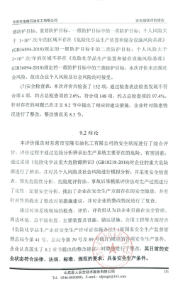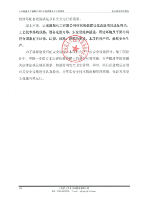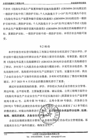有必要公开的其它内容: 经过定性、定量评价结果显示,该公司潜在的主要危险因素为火灾爆炸、容器爆炸、锅炉爆炸、中毒和窒息、灼烫和机械伤害等。 通过对该系统现场的检查、评价,评价组认为该企业目前在安全管理、外部安全条件、总平面布置、主要装置及设施、储运设施、公用工程等方面符合《危险化学品生产企业安全生产许可证实施办法》(原国家安全生产监督管理总局令第41号,总局令第79号及89号修正)规定的各项安全生产条件,企业认真落实了8.2章节提出的整改建议,对提出的隐患进行了整改,其目前的安全状态符合法律、法规、标准、规范的要求,具备安全生产条件。 企业还应继续加强安全管理,认真落实所制订的各项安全管理措施,落实提高安全生产条件的建议,确保安全生产。 | |||