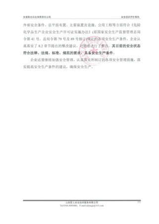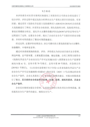 有必要公开的其它内容: 本评价报告对东营联合石化有限责任公司的安全状况进行了综合评价。评价过程中通过危险分析辨识出生产系统主要存在的危险、有害因素;通过采用《危险化学品重大危险源辨识》(GB18218-2018)对企业的重大危险源进行了辨识;并采用安全检查表、预先危险性分析、危险度评价法、事故后果模拟评价法对生产过程进行了定性、定量安全分析,找出了企业在安全生产方面存在的安全隐患,并有针对性的提出了整改对策措施建议,并对企业的整改情况进行了复查。 经过定性、定量评价结果显示,该厂潜在的主要危险因素为火灾爆炸、容器爆炸、锅炉爆炸、中毒和窒息、灼烫、触电、机械伤害、高处坠落、物体打击、起重伤害、车辆伤害、淹溺、噪声和振动、坍塌等。 通过对该系统现场的检查、评价,评价组认为该企业目前在安全管理、外部安全条件、总平面布置、主要装置及设施、公用工程等方面符合《危险化学品生产企业安全生产许可证实施办法》(原国家安全生产监督管理总局令第41号,总局令第79号及89号修订)规定的各项安全生产条件,企业认真落实了8.2章节提出的整改建议,对隐患进行了整改,其目前的安全状态符合法律、法规、标准、规范的要求,具备安全生产条件。 企业还要继续加强安全管理,认真落实所制订的各项安全管理措施,落实提高安全生产条件的建议,确保安全生产。