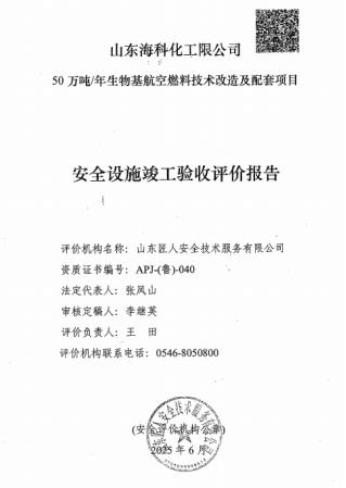 单位名称、项目名称:山东海科化工有限公司50万吨/年生物基航空燃料技术改造及配套项目安全设施竣工验收正文送审 | |||