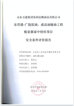 单位名称、项目名称:山东万通集团垦利金顺油品有限公司东营港-广饶原油、成品油输油工程配套郝家中转库项目 | |||