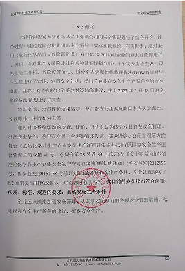 (8)本次评价共检查了280项,通过检查表法检查发现不符合项5项,约占总检查项的1.79%;符合项275项,约占总检查项的98.21%。针对本次评价提出的事故隐患及相应的建议整改对策措施,该公司对现场隐患经整改后,符合安全运行要求。 总体评价结论:通过对该系统现场的检查、评价,评价组认为该企业目前在安全管理、周边环境、总平面布置、主要装置及设施、储运设施、公用工程及辅助设施等方面符合《危险化学品生产企业安全生产许可证实施办法》(原国家安全生产监督管理总局令第41号,总局令第79号及89号修订)及《关于印发<山东省危险化学品生产企业安全生产许可证实施细则>的通知》(鲁安监发[2012]55号,鲁安监发[2015]168号修订)规定的各项安全生产条件,企业认真落实了8.2章节提出的整改建议,对提出的隐患进行了整改,其目前的安全状态符合法律、法规、标准、规范的要求,具备安全生产条件。