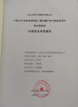 单位名称、项目名称:山东合益气体股份有限公司5吨/年半导体用高纯度三氟化硼(11B)气体技改项目安全设施竣工验收报告 | |||