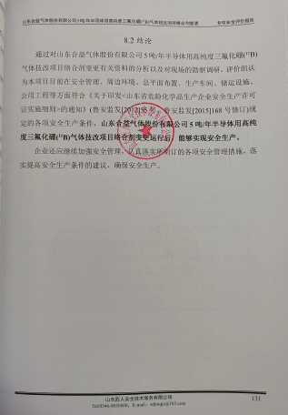 有必要公开的其它内容: 本次评价选择定性、定量安全评价方法,对建设项目中存在的危险、有害因素进行了辨识分析,对存在的问题提出了相应的整改建议,在对存在的问题进行整改复查的基础上,分析论证了本项目的安全条件及安全生产条件,得出以下结论: 通过对山东合益气体股份有限公司5吨/年半导体用高纯度三氟化硼(11B)气体技改项目络合剂变更有关资料的分析以及对现场的勘察调研,评价组认为本项目目前在安全管理、周边环境、总平面布置、生产车间、储运设施、公用工程等方面符合《关于印发<山东省危险化学品生产企业安全生产许可证实施细则>的通知》(鲁安监发[2012]55号,鲁安监发[2015]168号修订)规定的各项安全生产条件,山东合益气体股份有限公司5吨/年半导体用高纯度三氟化硼(11B)气体技改项目络合剂变更运行后,能够实现安全生产。 | |||