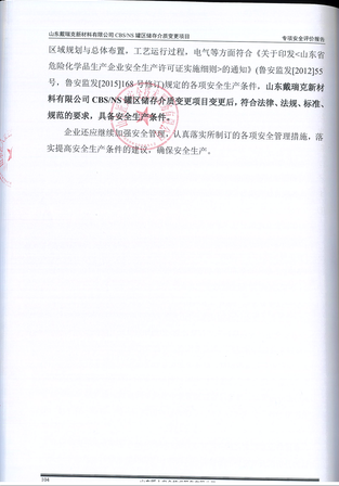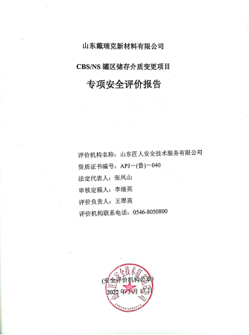有必要公开的其它内容: 通过对山东戴瑞克新材料有限公司CBS/NS罐区储存介质变更项目有关资料的分析以及对现场的勘察调研,本评价公司认为系统目前在安全管理,区域规划与总体布置,工艺运行过程,电气等方面符合《关于印发<山东省危险化学品生产企业安全生产许可证实施细则>的通知》(鲁安监发[2012]55号,鲁安监发[2015]168号修订)规定的各项安全生产条件,山东戴瑞克新材料有限公司CBS/NS罐区储存介质变更项目变更后,符合法律、法规、标准、规范的要求,具备安全生产条件。 | |||
