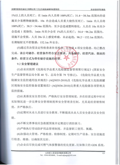 项目简介:东营市垦利区玖新工贸有限公司(简称“玖新工贸”)成立于2009年9月18日,注册地址位于东营市垦利区胜坨镇万达公寓以北1000米(属于山东省第四批化工园区中的东营市垦利区胜坨镇精细化工园区),法定代表人尚新建,注册资本壹亿元整,厂区占地面积约48700m2,现有职工18人。公司主要经营范围为一般项目:化工产品销售(不含许可类化工产品),建筑材料销售(除依法须经批准的项目外,凭营业执照依法自主开展经营活动);许可项目:危险化学品生产,危险化学品经营(依法须经批准的项目,经相关部门批准后方可开展经营活动,具体经营项目以审批结果为准)。厂区现有3万吨/年溶剂油生产项目。公司在原有3万吨/年溶剂油生产装置基础上进行60万吨/年溶剂油扩建项目,现已取得东营市应急管理局出具的危险化学品建设项目安全设施设计审查意见书(详见报告附件),正在建设中。 玖新工贸于2019年4月10日延期取得由山东省应急管理厅颁发的《安全生产许可证》,编号为:(鲁)WH安许证字[2019]050178号,有效期至2022年03月07日,许可范围为工况一:乙烯料5625吨/年、120#溶剂油9375吨/年、200#溶剂油15000吨/年;工况二:石脑油30000吨/年。 玖新工贸于2020年12月18日取得换发的《危险化学品登记证》,证书编号:370512174,登记品种有原料:石脑油,产品:石脑油(30000吨/年)、乙烯料(5625吨/年)、200#溶剂油(15000吨/年)、120号溶剂油(9375吨/年),有效期至2024年1月18日。 玖新工贸于2020年12月31日换发了由东营市应急管理局颁发的安全生产标准化三级企业证书(危险化学品),证书编号:东AQBWHⅢ202000050,有效期至2023年12月。 玖新工贸设有安全管理机构——安全科,配备专职安全管理人员2人(其中1人为注册安全工程师)。主要负责人及专职安全管理人员均取得了东营市应急管理局颁发的安全生产知识和管理能力考核合格证,行业类别为危险化学品生产,并在有效期内。 | |||