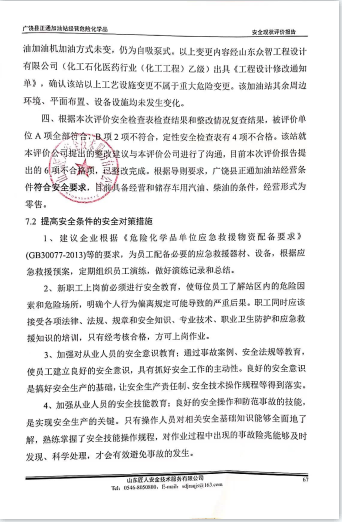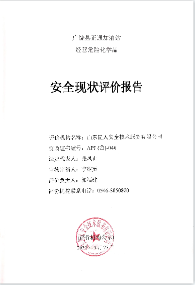 有必要公开的其它内容: 本评价报告对广饶县正通加油站的安全状况进行了综合评价。评价过程中通过危险分析辨识出生产系统主要存在的危险、有害因素;通过采用安全检查表、预先危险性分析评价法对加油站运营过程进行了定性安全分析,找出了企业在安全生产方面存在的安全隐患,并有针对性的提出了整对策措施建议,并于2022年3月对企业的整改情况进行了复查。 经过评价结果显示,该加油站潜在的主要危险因素为火灾爆炸、触电、机械伤害、高处坠落、物体打击、车辆伤害等。 通过对该加油站现场的检查、评价,评价组认为该项目目前在安全管理、站址选择及总平面布置、加油工艺及设施、其他设施等方面符合《危险化学品经营许可证管理办法》(国家安全生产监督管理总局令第55号,总局令第79号修正)及《山东省〈危险化学品经营许可证管理办法〉实施细则》(鲁安监发[2013]94号,鲁安监发[2015]168号修订)规定的各项安全生产条件,企业认真落实了8.2章节提出的整改建议,对隐患进行了整改,其目前的安全状态符合法律、法规、标准、规范的要求,具备安全经营条件。 企业还应继续加强安全管理,认真落实所制订的各项安全管理措施,落实提高安全生产条件的建议,确保安全生产。