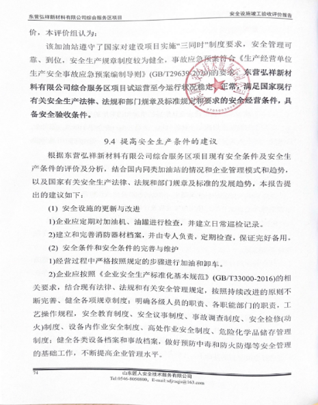 有必要公开的其它内容: (1)通过对该站涉及的物质、设备设施、公用工程、辅助设施等的危险有害因素辨识与分析,可知该站经营储存过程中汽油、柴油属于危险化学品;汽油属于火灾危险性为甲B类的液体,柴油属于火灾危险性为乙B类的液体。 (2)根据《危险化学品重大危险源辨识》(GB18218-2018)的规定,该加油站储存单元不构成危险化学品重大危险源。 (3)通过否决型检查表对该站的经营条件进行检查,共检查了61项,其中A类24项,B类37项。结果为A类全部合格,B类1项不合格,结论为:符合安全要求。 通过定性安全检查表对否决型安全检查表进行补充评价,本次评价共检查了90项,通过检查表法检查发现符合项88项,约占总检查项的97.8%,不符合项2项,约占总检查项的2.2%,不涉及项的0项,约占总检查项的0%。 (4)通过预先危险性分析法对主要设备运行过程中存在的主要危险有害因素进行评价,评价结果为:该加油站火灾爆炸的危险等级为Ⅱ~Ⅲ级;中毒和窒息、触电、坍塌、车辆伤害的危险等级为Ⅰ~Ⅱ级。 (5)由危险度评价分析可知:该加油站汽油储罐、汽油加油机、柴油储罐、柴油加油机的危险度均为Ⅲ级,低度危险。 (6)通过汽油、柴油储罐火灾事故树分析可知,要防止火灾事故,应重点控制油品泄漏及各种点火源。 本次评价选择定性、定量安全评价方法,对建设项目中存在的危险、有害因素进行了辨识分析,对存在的问题提出了相应的整改建议,在对存在的问题进行整改复查的基础上,分析论证了该加油站的安全条件,通过本次评价,本评价组认为: 该加油站遵守了国家对建设项目实施“三同时”制度要求,安全管理可靠、到位,安全生产规章制度较为健全,事故应急预案符合《生产经营单位生产安全事故应急预案编制导则》(GB/T29639-2020)的要求。东营弘祥新材料有限公司综合服务区项目试运营至今运行状况稳定、正常,满足国家现行有关安全生产法律、法规和部门规章及标准规定和要求的安全经营条件,具备安全验收条件。