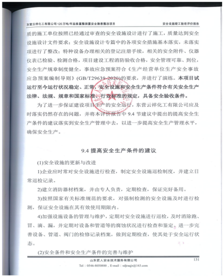 本次评价选择定性、定量安全评价方法,对建设项目中存在的危险、有害因素进行了辨识分析,对存在的问题提出了相应的整改建议,在对存在的问题进行整改复查的基础上,分析论证了本项目的安全条件及安全生产条件,通过本次评价,评价组认为: 本项目遵守了国家对建设项目实施“三同时”制度要求,委托具备相应资质的施工单位按照已经通过审查的安全设施设计进行了施工,质量达到安全设施设计文件要求;安全设施设计专篇中的各项安全措施基本落实,未落实项进行了整改;特种设备办理相关的登记注册手续,相关的安全附件、仪器仪表已检验、检测合格,项目建设工程消防验收合格,安全管理可靠、到位,安全生产规章制度健全,事故应急预案符合《生产经营单位生产安全事故应急预案编制导则》(GB/T29639-2020)的要求,并进行了演练。本项目试运行至今运行状况稳定、正常,安全设施和安全生产条件符合有关安全生产法律、法规、规章和国家标准、行业标准的规定,具备安全验收条件。 为了进一步保证建设项目生产的安全运行,东营云祥化工有限公司应及时落实仍然存在的问题,并将本评价报告中9.4节建议中提出的提高安全生产条件的建议落实到安全生产管理中去,以进一步提高安全生产管理水平,确保安全生产。