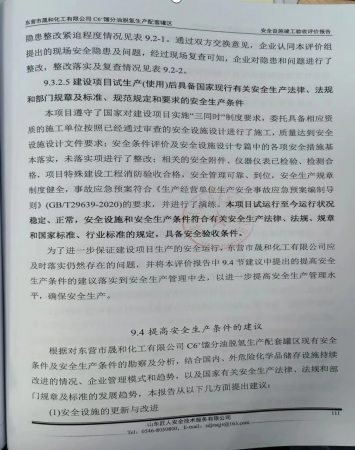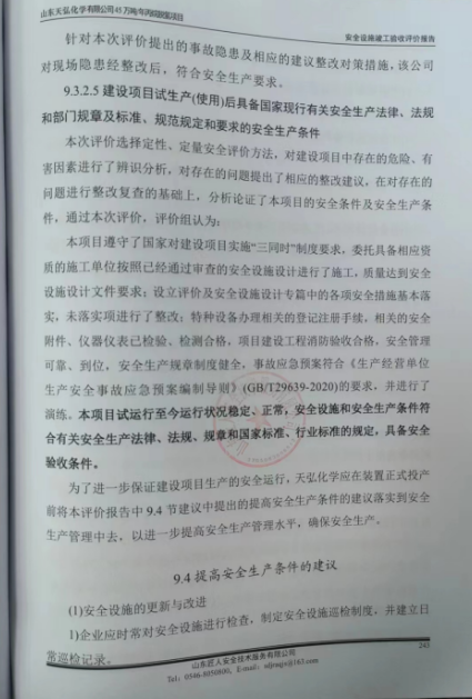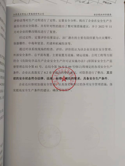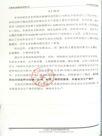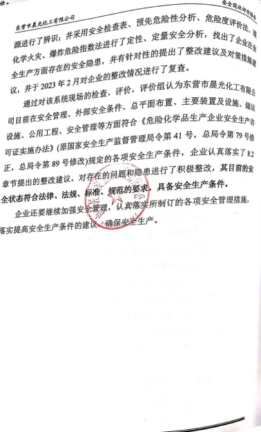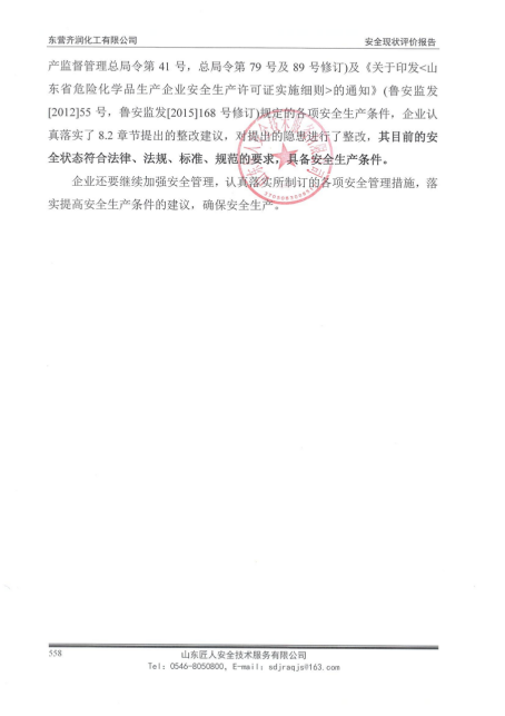 有必要公开的其它内容: 本评价报告对东营齐润化工有限公司的安全状况进行了综合评价。评价过程中通过危险分析辨识出生产系统主要存在的危险、有害因素;通过采用《危险化学品重大危险源辨识》(GB18218-2018)对企业的重大危险源进行了辨识;并采用安全检查表、预先危险性分析、危险度评价法、事故后果模拟评价法和道化学火灾爆炸指数评价法(DOW7)评价法等对生产过程进行了定性、定量安全分析,找出了企业在安全生产方面存在的安全隐患,并有针对性的提出了整改对策措施建议,并对企业的整改情况进行了复查。 经过定性、定量评价结果显示,该厂潜在的主要危险因素为火灾爆炸、容器爆炸、锅炉爆炸、中毒和窒息、灼烫、触电、机械伤害、高处坠落、物体打击、起重伤害、车辆伤害、淹溺、噪声和振动、坍塌等。 通过对该系统现场的检查、评价,评价组认为该企业目前在安全管理、外部安全条件、总平面布置、主要装置及设施、储运设施、公用工程等方面基本符合《危险化学品生产企业安全生产许可证实施办法》(原国家安全生产监督管理总局令第41号,总局令第79号及89号修订)及《关于印发<山东省危险化学品生产企业安全生产许可证实施细则>的通知》(鲁安监发[2012]55号,鲁安监发[2015]168号修订)规定的各项安全生产条件,企业认真落实了8.2章节提出的整改建议,对提出的隐患进行了整改,其目前的安全状态符合法律、法规、标准、规范的要求,具备安全生产条件。 企业还要继续加强安全管理,认真落实所制订的各项安全管理措施,落实提高安全生产条件的建议,确保安全生产。 | |||