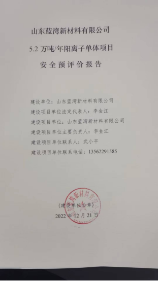 单位名称、项目名称:山东蓝湾新材料有限公司5.2万吨/年阳离子单体项目安全预评价报告 | |||