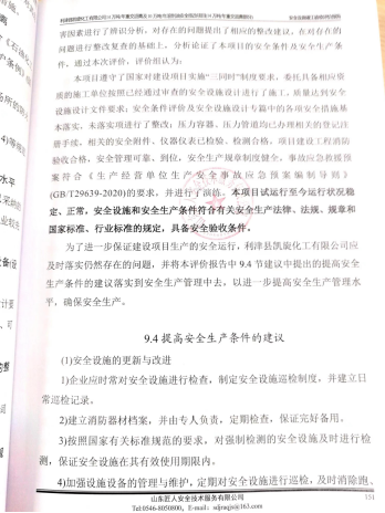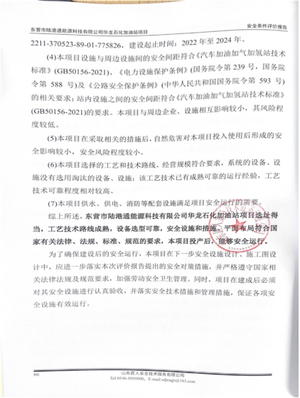 有必要公开的其它内容: 定性、定量安全评价方法对建设项目中存在的危险、有害因素进行了辨识分析,指出该加油站在安全方面存在的主要问题,提出了相应的整改建议,并对整改情况进行了复查,结论为: 一、该加油站内设施与周边设施间的防火间距符合《汽车加油加气加氢站技术标准》(GB50156-2021)、《建筑设计防火规范(2018年版)》(GB50016-2014)、《石油库设计规范》(GB50074-2014)的相关要求。 二、本次评价选择定性、定量安全评价方法,对建设项目中存在的危险、有害因素进行了辨识分析,对存在的问题提出了相应的整改建议,在对存在的问题进行整改复查的基础上,分析论证了该加油站的安全条件,通过本次评价,本评价组认为: 该加油站遵守了国家对建设项目实施“三同时”制度要求,安全管理可靠、到位,安全生产规章制度较为健全,事故应急预案符合《生产经营单位生产安全事故应急预案编制导则》(GB/T29639-2020)的要求。山东腾宇石化有限公司加油站建设项目试运营至今运行状况稳定、正常,满足国家现行有关安全生产法律、法规和部门规章及标准规定和要求的安全经营条件,具备安全验收条件。 | |||