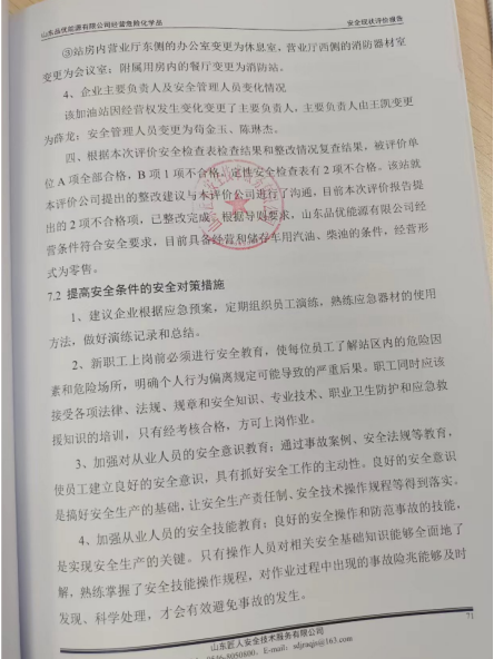 有必要公开的其它内容: 一、该站属二级加油站,火灾类别为B类火灾,主要危险有害因素为火灾、爆炸,本项目不构成危险化学品重大危险源。 二、该站主要负责人及安全管理人员取得了危险化学品经营安全生产知识和管理能力考核合格证,且在有效期内;建立了较完善的安全生产责任制、安全生产规章制度和岗位操作规程,编写了事故应急救援预案,有较齐全的安全设备及设施,对危险性较大的部位能够重点监控,储油罐区能得到有效的防护,采用了合理的操作工艺,经营场所位置合理,周边条件较好。 三、根据现场勘察,并对照上次评价报告。 1、周边环境变化情况:站区南侧围墙外隔墙临建蔬菜棚1座,其他未发生变化。 2、总平面布置、设备设施变化情况:站区原站房位于站区东侧营业室(便利店)内,现站房(利旧罩棚内原有闲置建筑)已移至罩棚下营业室(便利店已停用,停用证明见附件),不在评价范围内。 3、储存介质变化请况:由于《危险化学品目录》(2015版)(原国家安全生产监督管理局等十部门公告[2015]第5号,应急管理局等十部门公告[2022]第8号)已修订,故:储存介质柴油[闭杯闪点≤60℃]变更为柴油,实际存储介质未变化。 4、企业主要负责人及安全管理人员变化情况:该站主要负责人由刘如科变更为于洪波;安全管理人员由杨敏、刘树霞变更为韩志斌、魏士广。 四、根据本次评价安全检查表检查结果和整改情况复查结果,被评价单位A项全部合格,B项1项不合格,定性安全检查表有2项不合格。该站就本评价公司提出的整改建议与本评价公司进行了沟通,目前本次评价报告提出的2项不合格项,已整改完成。根据导则要求,东营市神舟物流有限责任公司孤东加油站经营条件符合安全要求,目前具备经营和储存车用汽油、柴油的条件,经营形式为零售。