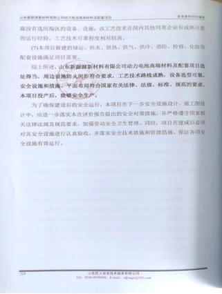 有必要公开的其它内容: 根据《应急管理部办公厅关于印发<淘汰落后危险化学品安全生产工艺技术设备目录(第一批)>的通知》(应急厅[2020]38号),本项目不涉及淘汰落后工艺技术装备。 (2)本项目拟建厂区位于东营港经济开发区东港路以西、港城路以北,拟建厂区所在地隶属东营港化工产业园(扩大区域),该园区属于山东省人民政府办公厅发布的第一批化工园区,符合化工园区规划要求。 本项目已取得东营市自然资源和规划局颁发的《不动产权证书》,并取得了东营市行政审批服务局颁发的《建设用地规划许可证》,土地用途为工业用地。 (3)本项目与《危险化学品安全管理条例》第十九条规定的相关场所的安全距离符合要求。本项目与周边企业、设施相互影响较小,其风险程度较低。 (4)本项目的总图布置满足《石油化工企业设计防火标准(2018年版)》(GB50160-2008)、《建筑设计防火规范(2018年版)》(GB50016-2014)及《石油化工工厂布置设计规范》(GB50984-2014)的相关要求。 (5)本项目在采取相关的措施后,自然危害不会对本项目投入生产或者使用后形成较大的安全影响,其风险程度较低。 (6)本项目选择的工艺和技术路线、处理规模符合要求,系统的设备、设施没有选用淘汰的设备、设施;该工艺技术在国内其他同类企业有成熟可靠的运行经验,工艺技术可靠程度相对较高。 (7)本项目新建的储运、供水、供热、供气、供冷、消防、检修、化验等配套设施满足项目需要。 综上所述,山东新蔚源新材料有限公司动力电池高端材料及配套项目选址得当,周边设施防火间距符合要求,工艺技术路线成熟,设备选型可靠,安全设施和措施、平面布局符合国家有关法律、法规、标准、规范的要求,本项目投产后,能够安全生产。 为了确保建设后的安全运行,本项目在下一步安全设施设计、施工图设计中,应进一步落实本次评价报告提出的安全对策措施,并严格遵守国家相关法律法规及规范要求,加强劳动安全卫生管理。同时,项目在建成后必须对其安全设施进行认真验收,并落实安全技术措施和管理措施,保证各项安全设施有效运行。