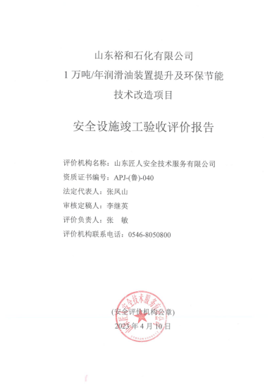 单位名称、项目名称:山东裕和石化有限公司1万吨年润滑油装置提升及环保节能技术改造项目 | |||