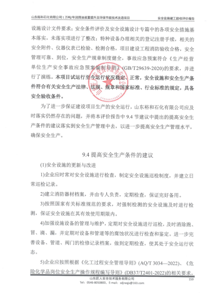 有必要公开的其它内容: 通过安全检查表评价,本次评价共检查了136项,通过检查表法检查发现符合检查要求的有134项,约占总检查项的98.5%;部分符合检查要求的有2项,约占总检查项的1.5%。企业认同本评价公司提出的对策措施,并进行了整改。 本项目主要存在火灾、爆炸、中毒和窒息、灼烫、触电、机械伤害、物体打击、高处坠落、噪声及振动、车辆伤害、淹溺、坍塌为主要危险有害因素。 (3)依据《危险化学品重大危险源辨识》(GB18218-2018)辨识及分级可知:本项目生产单元、储存单元均未构成危险化学品重大危险源。 (4)由预先危险性分析可知:本项目火灾爆炸、容器爆炸、中毒和窒息的危险等级为Ⅲ~Ⅳ级;灼烫、触电、机械伤害、高处坠落、物体打击、车辆伤害、淹溺、坍塌、噪声和振动危险等级为Ⅱ~Ⅲ级。 (5)由危险度评价分析可知:生产装置区的1#塔、2#塔、4#塔危险度等级为Ⅱ级(中度危险),3#塔的危险度等级为Ⅲ级(低度危险),罐区润滑油储罐、石化油浆储罐、沥青储罐、200#溶剂油储罐危险度等级为Ⅱ级(中度危险)。 (6)根据中国安全生产科学研究院《重大危险源区域定量风险评价软件》(CASST-QRA2.0)进行模拟计算,当1台1000m3 200#溶剂油储罐发生池火时最大死亡半径50m,重伤半径59m,轻伤半径83m,未产生多米诺影响区。 (7)通过《道七版》火灾、道化学爆炸指数评价法对各单元进行计算可知: 4#塔的火灾、爆炸危险等级为“中等”,一旦发生火灾爆炸,可对半径26.38m,面积为2185.14m2范围内人员造成伤亡,60%的设备、设施造成损坏。采取安全补偿措施后,其火灾、爆炸危险等级为“较轻”。 (8)本评价采用中国安全生产科学研究院的重大危险源区域定量风险评估软件针对整个厂区进行风险模拟分析: 该公司个人风险等值线中个人风险大于3×10-7次/年的区域内不存在《危险化学品生产装置和储存设施风险基准》(GB36894-2018)规定的高敏感防护目标、重要防护目标、一般防护目标中的一类防护目标;个人风险大于3×10-6次/年的区域内不存在《危险化学品生产装置和储存设施风险基准》(GB36894-2018)规定的一般防护目标中的二类防护目标;个人风险大于1×10-5次/年的区域内不存在《危险化学品生产装置和储存设施风险基准》(GB36894-2018)规定的一般防护目标中的三类防护目标。个人风险可接受,没有社会风险。 结论:本项目遵守了国家对建设项目实施“三同时”制度要求,委托具备相应资质的施工单位按照已经通过审查的安全设施设计进行了施工,质量达到安全设施设计文件要求;安全条件评价及安全设施设计专篇中的各项安全措施基本落实,未落实项进行了整改;特种设备办理相关的登记注册手续,相关的安全附件、仪器仪表已检验、检测合格,项目建设工程消防验收合格,安全管理可靠、到位,安全生产规章制度健全,事故应急预案符合《生产经营单位生产安全事故应急预案编制导则》(GB/T29639-2020)的要求,并进行了演练。本项目试运行至今运行状况稳定、正常,安全设施和安全生产条件符合有关安全生产法律、法规、规章和国家标准、行业标准的规定,具备安全验收条件。 | |||