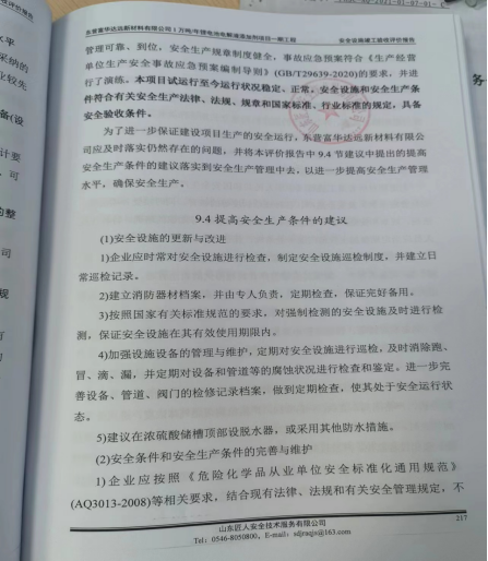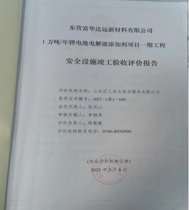 单位名称、项目名称:东营富华达远新材料有限公司1万吨/年锂电池电解液添加剂项目一期工程安全设施竣工验收评价 | |||
