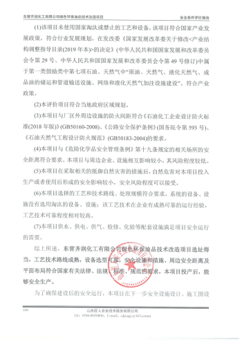 有必要公开的其它内容: (2)本评价项目符合当地政府区域规划。 (3)本项目与厂区外周边设施的防火间距符合《石油化工企业设计防火标准(2018年版)》(GB50160-2008)、《公路安全保护条例》(国务院令第593号)、《石油天然气工程设计防火规范》(GB50183-2004)的要求。 (4)本项目与《危险化学品安全管理条例》第十九条规定的相关场所的安全距离符合要求。本项目与周边企业、设施相互影响较小,其风险程度较低。 (5)本项目在采取相关的抵御自然灾害的措施后,自然危害对本项目投入生产或者使用后形成的安全影响较小,安全风险程度可以接受。 (6)本项目选择的工艺和技术路线、处理规模符合要求,系统的设备、设施没有选用淘汰的设备、设施;该工艺技术在企业有成熟可靠的运行经验,工艺技术可靠程度相对较高。 (7)本项目供水、供电、供气、检修、化验等配套设施满足项目安全运行的需要。 综上所述,东营齐润化工有限公司绿色环保油品技术改造项目选址得当,工艺技术路线成熟,设备选型可靠,安全设施和措施、周边安全距离及平面布局符合国家有关法律、法规、标准、规范的要求,本项目投产后,能够安全生产。