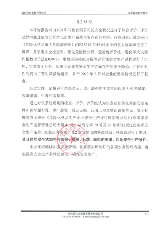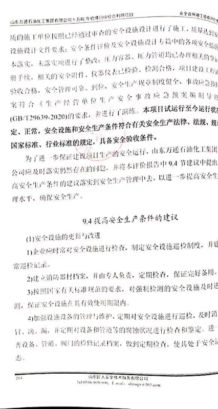 项目简介: 东营齐润化工有限公司(以下简称“齐润化工”)成立于2006年10月,注册资本28000万元,法人代表王建华,注册地址位于广饶县丁庄镇政府驻地,厂址位于省道319以东,东八路以南。经营范围:许可项目:危险化学品生产;黄金及其制品进出口(依法须经批准的项目,经相关部门批准后方可开展经营活动,具体经营项目以相关部门批准文件或许可证为准)。一般项目:化工产品销售(不含许可类化工产品);石油制品销售(不含危险化学品);普通货物仓储服务(不含危险化学品等需许可审批的项目);货物进出口;电器辅件销售。(除依法须经批准的项目外,凭营业执照依法自主开展经营活动)。 齐润化工厂区内包含两个公司,分别为东营齐润化工有限公司和东营云祥化工有限公司。厂区内属于齐润化工的生产装置、设施包括:300万吨/年原料油预处理装置、80万吨/年延迟焦化装置、40万吨/年汽油选择性加氢装置及轻汽油醚化装置、80万吨/年柴油加氢改质装置、15000Nm3/h制氢装置、15000Nm3/h制氢装置改造项目(即甲醇制氢装置)、60万吨/年重油提取装置、20万吨/年气体分离装置及4万吨/年MTBE装置、30吨/小时酸性水汽提及1.5万吨/年硫磺回收装置、低压瓦斯回收装置、12万吨/年硫酸装置、干气回收氢气装置及配套辅助设施(包括污水处理场、火炬系统、储存装卸设施(本次改造V22罐组、装卸车区及泵区所在位置)、公辅工程等)。属于云祥化工的装置、设施有150万吨/年加氢裂化装置、120万吨/年连续重整装置、48万吨/年芳烃抽提装置、3万标立/小时甲醇制氢装置、5万标立/小时PSA氢提浓装置、25万吨/年异构化装置等。 东营齐润化工有限公司、东营云祥化工有限公司两个公司建设项目统一规划,集中布置在一个厂区内,厂址位于山东省黄河三角洲农业高新技术产业示范区,省道319以东,东八路以南。两家企业统一管理(相关管理文件详见附件),两个企业之间能够实现管理班子统一调动,统一进行人员管理,统一进行生产管理,统一进行生产管理,统一进行安全管理,统一进行检维修管理,统一配备消防及其他安全设施,统一监控,信息联网及共享。 齐润化工于2023年3月2日换发了《安全生产许可证》,编号:(鲁)WH安许证字[2023]050142号,许可范围:汽油(39.5万吨/年)、液化石油气(16.15万吨/年)、柴油(107.51万吨/年)、石脑油(150.9万吨/年)、硫酸(10.0032万吨/年)、氨溶液[含氨>10%](0.6万吨/年)、丙烯(7万吨/年)、甲基叔丁基醚(4万吨/年)、硫磺(1.5万吨/年)、丙烷(0.903万吨/年);中间产品:酸性气、混合碳四、汽油、柴油、干气、硫化氢、氢、低分气,有效期至2026年2月26日。 齐润化工已取得《危险化学品登记证》,登记品种有原料:混合芳烃、异构化油、烷基化油、甲醇、石油原油、抽余油;中间产品:酸性气、混合碳四、汽油、柴油、干气、硫化氢、氢、低分气;产品:汽油、液化石油气、柴油、石脑油、硫酸、氨溶液[含氨>10%]、丙烯、甲基叔丁基醚、硫磺、丙烷;证书编号:370512125,有效期2021年3月27日至2024年3月26日。 齐润化工已于2022年8月23日取得安全生产标准化二级企业证书(危险化学品),证书编号:鲁AQBWHⅡ202200078,有效期至2025年8月。 齐润化工现有员工1099人,设有安全总监(注册安全工程师),全面负责公司安全监管工作,设有安全管理机构--安全科,另配备23名专职安全管理人员(其中10人为注册安全工程师)。主要负责人及专职安全管理人员安全生产知识和管理能力考核合格。 | |||