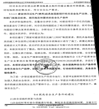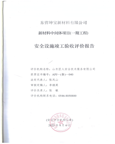 有必要公开的其它内容: 通过对东营坤宝新材料有限公司新材料中间体项目(一期工程)施工图设计文件、设备设施的法定检测等情况的检查以及对该建设项目的现场调研,按照《安全验收评价导则》(AQ8003-2007)的要求,依据国家、地方及行业的相关法律、法规、标准和规范,本次评价采用安全检查表、预先危险性分析、危险度评价等定性、定量安全评价方法、事故后果模拟法,对建设项目中存在的危险、有害因素进行了辨识分析,对建设项目的安全条件及工艺、设备设施的可靠性进行了分析论证,并对其危险、有害程度进行了定性、定量评价,提出了相应的安全对策措施。 本项目与厂外周边设施间的防火间距符合《石油化工企业设计防火标准(2018年版)》(GB50160-2008)、《精细化工企业工程设计防火标准》(GB51283-2020)、《建筑设计防火规范(2018年版)》(GB50016-2014)、《电力设施保护条例》(国务院令第239号,国务院令第588号修改)的相关要求。 本项目与《危险化学品安全管理条例》第十九条要求的相关场所的安全距离符合要求。 本项目选址满足《化工企业总图运输设计规范》(GB50489-2009)等规范的要求。 本建设项目在安全设施设计专篇中设计的安全设施已采纳,安全设施符合国家有关标准、规范,采取的安全设施处于国内同类企业较先进水平。 该建设项目试生产过程中,设备运行平稳,工况参数符合工艺及设计要求。仪表控制系统运行正常,操作灵活好用,自动保护灵敏准确,安全、可靠性和安全水平相对较好。 针对本次评价提出的事故隐患及相应的建议整改对策措施,该公司对现场隐患经整改后,符合安全生产要求。 本次评价选择定性、定量安全评价方法,对建设项目中存在的危险、有害因素进行了辨识分析,对存在的问题提出了相应的整改建议,在对存在的问题进行整改复查的基础上,分析论证了本项目的安全条件及安全生产条件,通过本次评价,评价组认为: 本项目遵守了国家对建设项目实施“三同时”制度要求,委托具备相应资质的施工单位按照已经通过审查的安全设施设计进行了施工,质量达到安全设施设计文件要求;设立评价及安全设施设计专篇中的各项安全措施基本落实,未落实项进行了整改;特种设备办理相关的登记注册手续,相关的安全附件、仪器仪表已检验、检测合格,项目建设工程消防验收合格,安全管理可靠、到位,安全生产规章制度健全,事故应急预案符合《生产经营单位生产安全事故应急预案编制导则》(GB/T29639-2020)的要求,并进行了演练。本项目试运行至今运行状况稳定、正常,安全设施和安全生产条件符合有关安全生产法律、法规、规章和国家标准、行业标准的规定,具备安全验收条件。 为了进一步保证建设项目生产的安全运行,东营坤宝新材料有限公司应加强人员的安全培训,并将本评价报告中9.4节建议中提出的提高安全生产条件的建议落实到安全生产管理中去,以进一步提高安全生产管理水平,确保安全生产。