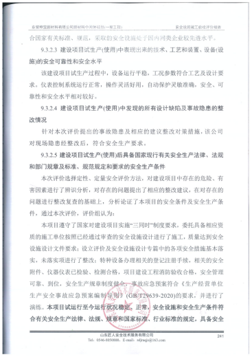 有必要公开的其它内容: 本次评价选择定性、定量安全评价方法,对建设项目中存在的危险、有害因素进行了辨识分析,对存在的问题提出了相应的整改建议,在对存在的问题进行整改复查的基础上,分析论证了本项目的安全条件及安全生产条件,通过本次评价,评价组认为: 本项目遵守了国家对建设项目实施“三同时”制度要求,委托具备相应资质的施工单位按照已经通过审查的安全设施设计进行了施工,质量达到安全设施设计文件要求;设立评价及安全设施设计专篇中的各项安全措施基本落实,未落实项进行了整改;特种设备办理相关的登记注册手续,相关的安全附件、仪器仪表已检验、检测合格,项目建设工程消防验收合格,安全管理可靠、到位,安全生产规章制度健全,事故应急预案符合《生产经营单位生产安全事故应急预案编制导则》(GB/T29639-2020)的要求,并进行了演练。本项目试运行至今运行状况稳定、正常,安全设施和安全生产条件符合有关安全生产法律、法规、规章和国家标准、行业标准的规定,具备安全验收条件。 为了进一步保证建设项目生产的安全运行,东营坤宝新材料有限公司应加强人员的安全培训,并将本评价报告中9.4节建议中提出的提高安全生产条件的建议落实到安全生产管理中去,以进一步提高安全生产管理水平,确保安全生产。 | |||