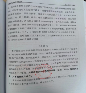 有必要公开的其它内容: (1)与《危险化学品安全管理条例》第十九条规定的相关场所的防火间距符合要求。厂内设备设施与厂外周边设施间的防火间距符合《石油化工企业设计防火标准(2018年版)》(GB50160-2008)、《电力设施保护条例》(国务院令第239号,国务院令第588号修订)的要求。 (2)由危险度评价法可知:润滑油精制装置、甲醇制氢装置、液化气罐组的危险度为“Ⅰ级”,危险程度高度危险;220万吨/年劣质原料油预处理装置、3#罐组、4#罐组、5#罐组、6#罐组、7#罐组、8#罐组、9#罐组的危险度为“Ⅱ级”,危险程度中度危险。 (3)依据《危险化学品重大危险源辨识》(GB18218-2018)辨识及分级可知:220万吨/年劣质原料油预处理装置(220万吨/年常减压装置单元/25吨/时酸性水汽提单元)、润滑油精制装置装置(甲醇制氢单元/加氢单元/异构脱蜡单元单元/润滑油精制装置技术改造)、15000Nm3/h甲醇制氢单元未构成危险化学品重大危险源;5#罐组单元、7#罐组单元构成三级危险化学品重大危险源,8#罐组单元、液化石油气单元构成四级危险化学品重大危险源。 (4)由预先危险性分析可知:火灾爆炸、容器爆炸、中毒和窒息、锅炉爆炸的危险等级为Ⅲ~Ⅳ级;灼烫、触电、机械伤害、高处坠落、物体打击、起重伤害、车辆伤害、淹溺、噪声和振动、冻伤、坍塌危险等级为Ⅱ~Ⅲ级。 (5)通过《道七版》火灾、道化学爆炸指数评价法对各单元进行计算可知: 补润滑油精制装置的加氢精制反应器、加氢裂化反应器,技术改造单元的加氢精制反应器、加氢改质反应器,异构脱蜡单元的异构脱蜡反应器、补充精制反应器的火灾、爆炸危险等级为“非常大”,一旦发生火灾爆炸,可对半径44.5m,面积6218m2范围内人员造成伤亡,84%的设备、设施造成损坏,通过采取一系列安全措施后,危险程度补偿后火灾爆炸指数为97.4,危险等级为“中等”。 润滑油精制装置分解变换反应器,甲醇制氢装置的分解变换反应器的火灾、爆炸危险等级为“很大”,一旦发生火灾爆炸,可对半径38.4m,面积4630m2范围内人员造成伤亡,82%的设备、设施造成损坏,通过采取一系列安全措施后,危险程度补偿后火灾爆炸指数为85.5,危险等级为“较轻”。 220万吨/年劣质原料油预处理装置的初馏塔的火灾、爆炸危险等级为“较轻”,一旦发生火灾爆炸,可对半径24.1m,面积1824m2范围内人员造成伤亡,68%的设备、设施造成损坏,通过采取一系列安全措施后,危险程度补偿后火灾爆炸指数为52.9,危险等级为“最轻”。 220万吨/年劣质原料油预处理装置减压塔的火灾、爆炸危险等级为“较轻”,一旦发生火灾爆炸,可对半径16.9m,面积897m2范围内人员造成伤亡,68%的设备、设施造成损坏,通过采取一系列安全措施后,危险程度补偿后火灾爆炸指数为37.0,危险等级为“最轻”。 通过分析可知,火灾、爆炸的危险性主要决定于物料性质、物料储量以及相应的安全设施设备情况;另外,企业的安全管理状况等对其危险性也会有较大的影响,今后应当加强安全管理,健全落实各项安全管理制度,采取严格和行之有效的安全防护措施,并不断提高职工的自身安全意识,才能保证生产的“长、安、稳”优质运行。 采用中国安全生产科学研究院《重大危险源区域定量风险评价软件》(CASST-QRA2.1)进行模拟计算可知:柴油储罐整体破裂发生池火,死亡半径为124m,重伤半径为140m,轻伤半径为186m,未产生多米诺效应。 通过对1座168m3液化石油气卧罐进行蒸气云爆炸定量模拟评价,发生蒸气云爆炸时,死亡半径为17.5m;财产损失半径为46.9m;人员安全距离确定为89.3m;火球当量半径为36.5m;火球持续时间为5.7s;本项目涉及的液化石油气卧罐容器整体破裂发生BLEVE则可能引起的多米诺半径为181m。 (8)通过事故后果模拟法分析可知:吸入硫化氢5~10min致死的浓度为0.08-0.1%,有毒气体的扩散半径为57.13m;吸入硫化氢0.5~1h致死的浓度为0.042-0.06%,有毒气体的扩散半径为77.3m;吸入硫化氢0.5~1h致重病的浓度为0.036-0.05%,有毒气体的扩散半径为81.9m。 (9)安全检查表评价过程见附件3.1-1~3.1-5,评价结果汇总情况见附件表3.1-6。本次评价共检查了249项,通过检查表法检查发现不符合项5项,约占总检查项的2%;符合项244项,约占总检查项的98%。针对存在的问题已在正文8.2节中提出了相应的建议措施,企业针对隐患情况进行了整改,整改情况见8.3节。 (10)个人风险和社会风险 通过CASST-QRA2.0软件进行模拟计算可知:个人风险>3×10-6次/年的区域内不存在《危险化学品生产装置和储存设施风险基准》(GB36894-2018)规定的高敏感防护目标、重要防护目标、一般防护目标中的一类防护目标;个人风险>1×10-5次/年的区域内不存在《危险化学品生产装置和储存设施风险基准》(GB36894-2018)规定的一般防护目标中的二类防护目标;个人风险>3×10-5次/年的区域内不存在《危险化学品生产装置和储存设施风险基准》(GB36894-2018)规定的一般防护目标中的三类防护目标;本次评价奥星石化的社会风险处于可接受区。该公司储罐区采用DCS控制,可以实现对工艺过程中液位、温度等重要参数的监测、记录和报警。各储罐均设置高、低液位报警,高高液位连锁关闭入口阀、低低液位联锁关闭出口阀,防止冒罐、抽空;罐区设置有可燃气体报警设施;罐区周围设置有消防通道、消火栓及消防炮等消防设施等;操作员经培训,考核合格后上岗作业,操作员均训练有素且