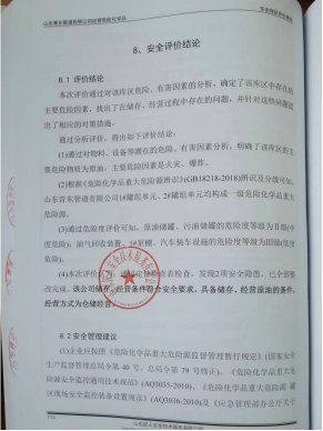 有必要公开的其它内容: 通过分析评价,得出如下评价结论: (1)通过对物料、设备等潜在的危险、有害因素分析,明确了该库区的主要危险物质为原油,主要危险因素是火灾、爆炸。 (2)根据《危险化学品重大危险源辨识》(GB18218-2018)辨识及分级可知,山东青东管道有限公司1#罐组单元、2#罐组单元均构成一级危险化学品重大危险源。 (3)通过危险度评价可知,原油储罐、污油储罐的危险度等级为Ⅱ级(中度危险);油气回收装置、1#泵棚、汽车装车设施的危险度等级为Ⅲ级(低度危险)。 (4)本次评价认为:通过定性检查表检查,发现2项安全隐患,已全部整改完成。该公司储存、经营条件符合安全要求,具备储存、经营原油的条件,经营方式为仓储经营。
