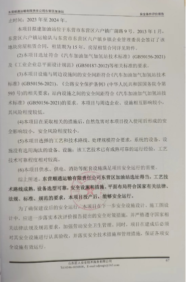 有必要公开的其它内容: ,结论为: (1)本项目不属于《产业结构调整指导目录(2019年本)》(国家发改委令第29号,2021年第49号修订)中“限制类”、“淘汰类”、“鼓励类”所列的项目,符合国家产业政策。 2021年4月6日,东营市商务局出具了《东营市商务局关于东营市胜发成品油零售有限责任公司等企业申请加油站原址改扩建的批复》(包含东营区六户镇劳动服务公司油料供应处,位于东营区六户镇广蒲路9号),编号为东商务字[2021]27号。东营市商务局于2023年4月17日同意东营顺通运输有限责任公司东营区加油站原址改扩建的延期申请,详见报告附件:《东营市成品油零售经营网点原址改扩建备案申请表》复印件。 2023年4月25日,东营顺通运输有限责任公司东营区加油站取得了山东省建设项目备案证明,项目代码为:2304-370502-89-01-297198,建设起止时间:2023年至2024年。 本项目拟建加油站位于东营市东营区六户镇广蒲路9号。2013年1月,东营区六户镇运输队与东营市东营区六户镇乡镇企业管理委员会签订了该地块房屋租赁合同,租赁期为15年,房屋租赁合同详见附件。 (2)本项目选址符合《汽车加油加气加氢站技术标准》(GB50156-2021)及《工业企业总平面设计规范》(GB50187-2012)等相关标准的要求。 (3)本项目设施与周边设施间的安全间距符合《汽车加油加气加氢站技术标准》(GB50156-2021)、《公路安全保护条例》(中华人民共和国国务院令第593号)的相关要求;站内设施之间的安全间距符合《汽车加油加气加氢站技术标准》(GB50156-2021)的要求。本项目与周边企业、设施相互影响较小,其风险程度较低。 (4)本项目在采取相关的措施后,自然危害对本项目投入使用后形成的安全影响较小,安全风险程度较小。 (5)本项目选择的工艺和技术路线、处理规模符合要求,系统的设备、设施没有选用淘汰的设备、设施;该工艺技术已有成熟可靠的运行经验,工艺技术可靠程度相对较高。 (6)本项目供水、供电、消防等配套设施满足项目安全运行的需要。 综上所述,东营顺通运输有限责任公司东营区加油站选址得当,工艺技术路线成熟,设备选型可靠,安全设施和措施、平面布局符合国家有关法律、法规、标准、规范的要求,本项目投产后,能够安全运行。 | |||