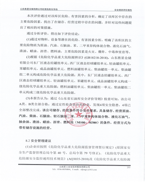 有必要公开的其它内容: 本次评价通过对山东昌恒石油化工有限公司燃料油、重油、柴油、轻蜡油储存经营项目(暨环保提升项目)危险、有害因素的分析,确定了该石油库中存在的主要危险因素,找出了在储存、经营过程中存在的问题,并针对这些问题提出了相应的对策措施。 通过分析评价,得出如下评价结论: (1)通过对物料、设备等潜在的危险、有害因素分析,明确了该石油库的主要危险物质为柴油、轻蜡油、燃料油、重油;本项目储存过程中主要存在火灾爆炸、中毒和窒息、触电、机械伤害、车辆伤害、高处坠落、噪声及振动、物体打击、灼烫等危险有害因素。其中火灾爆炸的危险等级为“Ⅲ~Ⅳ级”;触电、高处坠落、机械伤害、中毒和窒息、车辆伤害、物体打击的危险等级为“Ⅱ~Ⅲ级”;噪声及振动、灼烫的危险等级为“Ⅰ~Ⅱ级”。 (2)依据危险化学品重大危险源分级标准,山东昌恒石油化工有限公司不涉及危险化学品重大危险源。 (3)由危险度评价分析可知:罐组的危险度等级为Ⅱ级(中度危险),泵棚的危险度等级为Ⅲ级(低度危险)。 (4)通过定性安全检查表可知,本次评价共检查了76项,通过检查表法检查发现不符合项2项,约占总检查项的2.6%;符合项74项,约占总检查项的97.4%,已整改完成。 (5)通过对《山东省石油库安全评价导则安全评价现场检查表》中的内容进行逐项检查,其中有50项A类内容,31项B类内容。安全检查结果为A类37条合格,其余不参与检查;B类21条合格,其余不参与检查。因此,检查结果符合安全要求。 综上所述,该公司储存、经营条件符合安全要求,具备储存、经营危险化学品(柴油)及非危险化学品(轻蜡油、燃料油、重油)的条件,经营方式为带有储存设施的经营。
