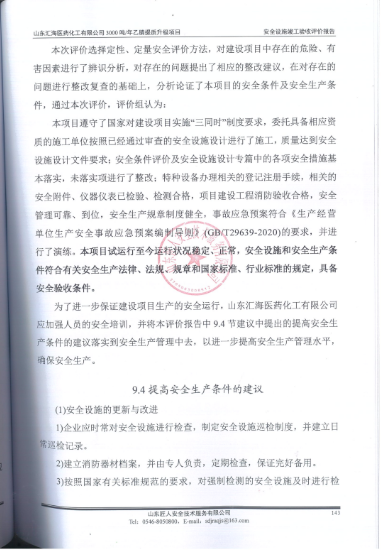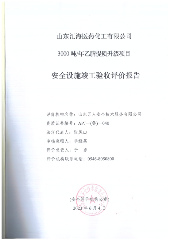 单位名称、项目名称:山东汇海医药化工有限公司3000吨/年乙腈提质升级项目安全设施竣工验收评价报告 | |||