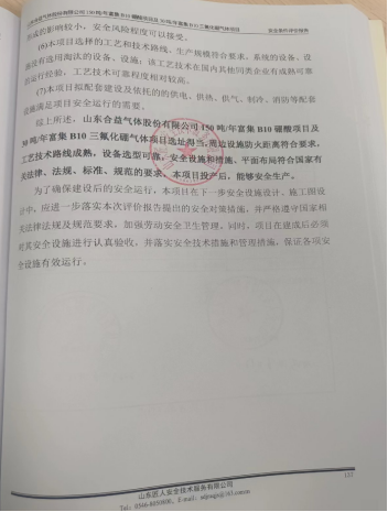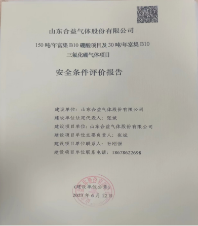 单位名称、项目名称:山东合益气体股份有限公司150吨/年富集B10硼酸项目及30吨/年富集B10三氟化硼气体项目安全条件评价报告 | |||