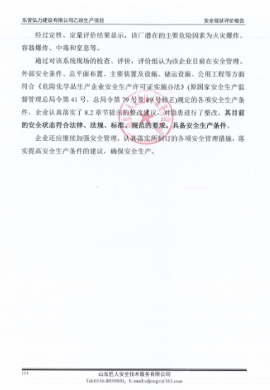 有必要公开的其它内容: 本评价报告对东营弘力建设有限公司乙炔生产项目的安全状况进行了综合评价。评价过程中通过危险分析辨识出生产系统主要存在的危险、有害因素;通过采用《危险化学品重大危险源辨识》(GB18218-2018)对企业的重大危险源进行了辨识;并采用安全检查表、预先危险性分析、危险度评价法、道化学火灾爆炸指数评价法(DOW7)评价法等对生产过程进行了定性、定量安全分析,找出了企业在安全生产方面存在的安全隐患,并有针对性的提出了整对策措施建议,并对企业的整改情况进行了复查。 经过定性、定量评价结果显示,该厂潜在的主要危险因素为火灾爆炸、容器爆炸、中毒和窒息等。 通过对该系统现场的检查、评价,评价组认为该企业目前在安全管理、外部安全条件、总平面布置、主要装置及设施、储运设施、公用工程等方面符合《危险化学品生产企业安全生产许可证实施办法》(原国家安全生产监督管理总局令第41号,总局令第79号及89号修正)规定的各项安全生产条件,企业认真落实了8.2章节提出的整改建议,对隐患进行了整改,其目前的安全状态符合法律、法规、标准、规范的要求,具备安全生产条件。 企业还应继续加强安全管理,认真落实所制订的各项安全管理措施,落实提高安全生产条件的建议,确保安全生产。 | |||