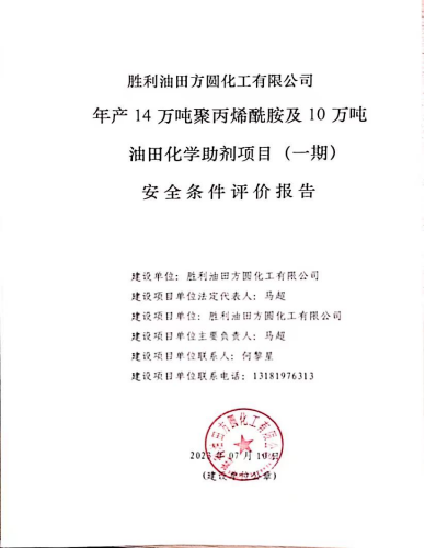单位名称、项目名称:胜利油田方圆化工有限公司年产14万吨聚丙烯酰胺及10万吨油田化学助剂项目(一期)安全条件评价 | |||