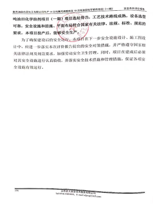 有必要公开的其它内容: 本次评价采用预先危险性分析、安全检查表、危险度评价法、道化学火灾、爆炸危险指数法、池火灾事故后果模型等定性、定量安全评价方法,对建设项目中可能存在的危险、有害因素进行了辨识分析,并对其危险、有害程度进行了定性、定量评价,提出了相应的安全对策措施。 通过检查、评价,评价组认为胜利油田方圆化工有限公司年产14万吨聚丙烯酰胺及10万吨油田化学助剂项目(一期)项目选址得当,工艺技术路线成熟,设备选型可靠,安全设施和措施、平面布局符合国家有关法律、法规、标准、规范的要求,本项目投产后,能够安全生产。 为了确保建设后的安全运行,本项目在下一步安全设施设计、施工图设计中,应进一步落实本次评价报告提出的安全对策措施,并严格遵守国家相关法律法规及规范要求,加强劳动安全卫生管理。同时,项目在建成后必须对其安全设施进行认真验收,并落实安全技术措施和管理措施,保证各项安全设施有效运行。 | |||
