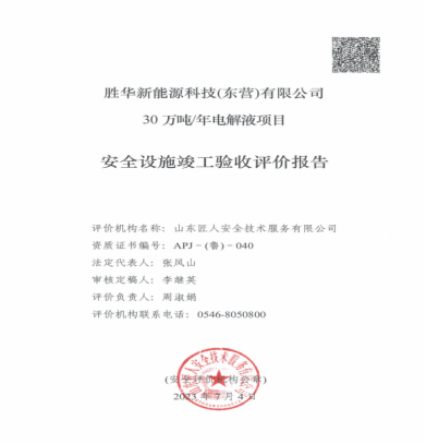 单位名称、项目名称:胜华新能源科技(东营)有限公司30万吨/年电解液项目安全设施竣工验收评价报告 | |||