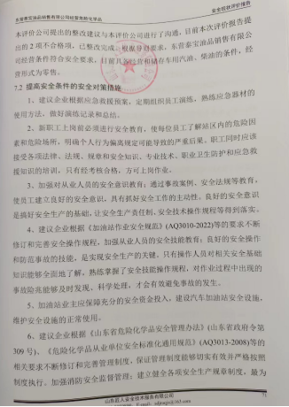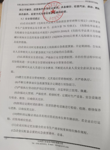 有必要公开的其它内容: 一、该站属二级加油站,火灾类别为B类火灾,主要危险有害因素为火灾、爆炸,本项目不构成危险化学品重大危险源。 二、该站主要负责人及安全管理人员取得了危险化学品经营安全生产知识和管理能力考核合格证,且在有效期内;建立了较完善的安全生产责任制、安全生产规章制度和岗位操作规程,编写了事故应急救援预案,有较齐全的安全设备及设施,对危险性较大的部位能够重点监控,储油罐区能得到有效的防护,采用了合理的操作工艺,经营场所位置合理,周边条件较好。 三、根据现场勘察,并对照上次评价报告。 1、周边环境变化情况 西侧广饶科力达石化科技有限公司厂区内新建3301罐组(丙B类,内浮顶,单罐容积2000m3/5000m3);北侧广饶科力达石化科技有限公司厂区内新建3101罐组(丙B类,钢制双盘外浮顶,单罐容积50000m3)。 2、平面布置、设备设施变化情况 ①罐区与上次换证相比,储罐的数量、储存介质、容量、位置、布置均未发生变化。 3、企业主要负责人及安全管理人员变化情况 该站主要负责人由燕清喜变更为李超;安全管理人员由赵潇、王丽燕变更为焦文杰、贾海玲。 四、根据本次评价安全检查表检查结果和整改情况复查结果,被评价单位A项全部合格,B项1项不合格,定性安全检查表有2项不合格。该站就本评价公司提出的整改建议与本评价公司进行了沟通,目前本次评价报告提出的2项不合格项,已整改完成。根据导则要求,东营泰宝油品销售有限公司经营条件符合安全要求,目前具备经营和储存车用汽油、柴油的条件,经营形式为零售。 ![]() | |||
