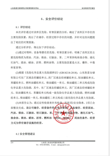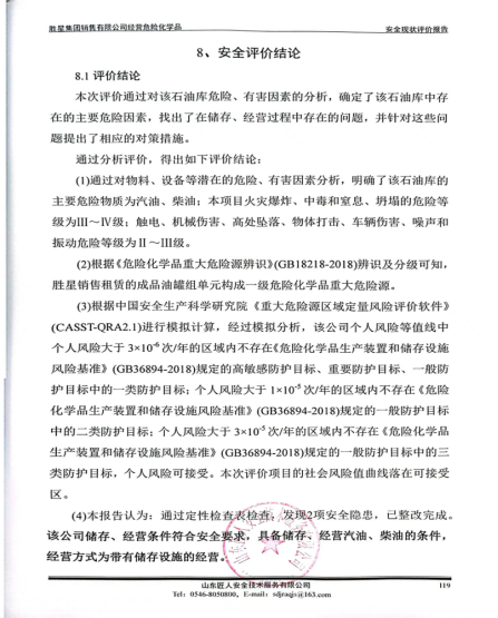 有必要公开的其它内容: 本次评价通过对胜凯石化危险、有害因素的分析,确定了该成品油储存设施存在的主要危险因素,找出了在储存、经营过程中存在的问题,并针对这些问题提出了相应的对策措施。 通过分析评价,得出如下评价结论: (1)通过预先危险性分析,本项目经营过程中主要存在火灾爆炸、容器爆炸、电气火灾、触电、中毒和窒息、高处坠落、物体打击、机械伤害、车辆伤害、噪声及振动、淹溺、灼烫等危险有害因素。其中火灾爆炸的危险等级为“Ⅲ~Ⅳ级”;中毒和窒息、触电、容器爆炸、电气火灾、高处坠落、物体打击、机械伤害、车辆伤害、噪声及振动、淹溺、灼烫的危险等级为“Ⅱ~Ⅲ级”。 (2)根据《危险化学品重大危险源辨识》(GB18218-2018)辨识及分级可知,胜凯石化有限责任公司汽/柴油罐组单元构成一级危险化学品重大危险源。 经过模拟分析,该公司个人风险等值线中个人风险基准大于3×10-6次/年的区域内不存在《危险化学品生产装置和储存设施风险基准》(GB36894-2018)规定的高敏感防护目标、重要防护目标、一般防护目标中的一类防护目标;个人风险基准大于1×10-5次/年的区域内不存在《危险化学品生产装置和储存设施风险基准》(GB36894-2018)规定的一般防护目标中的二类防护目标;个人风险基准大于3×10-5次/年的区域内不存在《危险化学品生产装置和储存设施风险基准》(GB36894-2018)规定的一般防护目标中的三类防护目标。根据CASST-QRA2.1软件计算机模拟计算结果显示,本次评价的社会风险值曲线全部在可接受区。 (3)通过危险度评价可知,5000m³汽油储罐的危险度等级为Ⅰ级(高度危险);5000m³柴油储罐的危险度等级为Ⅱ级(中度危险);发车泵棚、装车油气回收装置的危险度等级为Ⅲ级(低度危险)。 (4)该公司储存设施为石油化工厂区内的成品油储存罐区,本次评价主要依据《石油库设计规范》(GB50074-2014)、《石油化工企业设计防火标准(2018年版)》(GB50160-2008)对其经营条件进行检查,通过否决型及定性检查表补充检查,共发现2项安全隐患,现已整改完成。目前其经营和储存场所、设施、建筑物等设备设施符合《危险化学品经营许可证管理办法》(原国家安监总局55号令,总局令第79号修正)规定的各项安全经营条件,该公司储存、经营条件符合安全要求,具备储存经营汽油、柴油的条件,经营方式为带有储存设施的经营;具备经营(无储存)危险化学品苯,液化石油气,异辛烷,甲醇,丙烯,丙烷,甲基叔丁基醚,芳烃,异丁烷,二甲苯异构体混合物的条件,经营方式为不带有储存设施的经营。