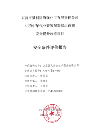 单位名称、项目名称:东营市垦利区海强化工有限责任公司6万吨/年气分装置配套储运设施安全条件评价 | |||