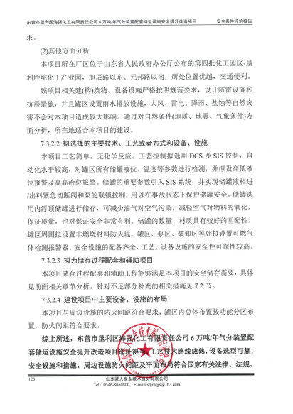 项目简介: 东营市垦利区海强化工有限责任公司(以下简称“海强化工”)原名垦利县海强化工有限责任公司(2019年5月30日变更企业名称),位于垦利胜坨化工产业园(属于山东省第四批化工园区中的东营市垦利区胜坨镇精细化工园区)旭辰路以东、元邦路以南,成立于2013年7月16日,法定代表人宋金平,注册资金600万元整,现有员工22人,经营范围:液化石油气1.92万吨/年、稳定轻烃2.4万吨/年、正丁烷0.75万吨/年、异丁烷0.75万吨/年生产(有效期限以许可证为准),化工产品(不含危险化学品)销售。 海强化工已取得不动产权证,厂区占地面积约31426m2,现有1套6万吨/年气分装置及其配套设施。 该公司设有安全管理机构—安全办,设专职安全管理人员2人(其中1人为注册安全工程师)。主要负责人和专职安全管理人员均取得安全生产知识和管理能力考核合格证,并定期复审,均在有效期内。公司制定有安全生产责任制、安全生产管理制度和操作规程。 由于原稳定轻烃储罐及装卸区距离办公室较近,且公司现有稳定轻烃储罐容积较小,为保障全厂生产的平稳和原料的稳定供应,海强化工拟投资3000万元在厂区东侧空地建设6万吨/年气分装置配套储运设施安全提升改造项目(以下简称“本项目”),主要建设1座罐区(内含3座2000m3稳定轻烃内浮顶储罐)、7台装车泵(其中5台装车泵为原泵区移至本泵区[1台异丁烷装车泵、1台正丁烷装车泵、1台液化石油气装车泵、2台稳定轻烃装车泵]、新增2台稳定轻烃装车泵)、2台压缩机(原泵区移至本泵区)、6个装卸鹤位(其中3个鹤位为原装卸区移至本装卸区[1个液化烃卸车鹤位、1个液化石油气装车鹤位、1个稳定轻烃装车鹤位]、新增1个异丁烷装车鹤位、1个正丁烷装车鹤位、1个稳定轻烃装车鹤位)。 | |||