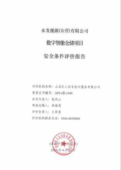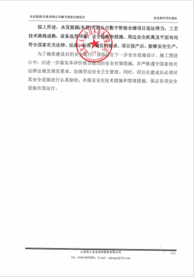 有必要公开的其它内容: 通过对东营景洪盐化有限公司500吨/年溴素项目安全节能及质量提升技术改造项目有关资料的分析以及对该建设项目现场的勘察调研,按照《安全预评价导则》(AQ8002-2007)等的要求,依据国家、地方及行业的相关法律、法规、标准和规范,评价组认为永发能源(东营)有限公司数字智能仓储项目选址得当,工艺技术路线成熟,设备选型可靠,安全设施和措施、平面布局符合国家有关法律、法规、标准、规范的要求,本项目投产后,能够安全生产。