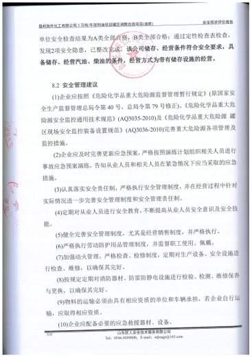 有必要公开的其它内容: 公司的危险有害因素进行了分析,辨识了危险化学品重大危险源,运用预先危险性分析、安全检查表、危险度、事故后果模拟的方法对该项目进行了综合评价,指出该公司在安全方面存在的主要问题,提出了相应的整改建议,并对整改情况进行了复查,结论为: 一、该项目存在主要危险有害因素为火灾、爆炸,该项目构成危险化学品三级重大危险源。 二、该企业主要负责人及安全管理人员取得了危险化学品安全生产知识和管理能力考核合格证,且在有效期内;建立了较完善的安全生产责任制、安全生产规章制度和岗位操作规程,编写了事故应急救援预案,有较齐全的安全设备及设施,对危险性较大的部位能够重点监控,储油罐组能得到有效的防护,采用了合理的操作工艺,经营场所位置合理,周边条件较好。 三、根据现场勘察,并对照上次评价报告。 1)储罐 ①原料产品罐组内储罐(含本项目4#、7#、8#储罐)浮盘材质由铝质浮盘变更为钢质浮盘(浮盘高度1.5m); ②原料产品罐组汽油储罐(4#罐)氮封停用; 该企业提供了钢制单层浮盘的购买合同,购买合同见附件。 该企业原料产品罐组4#、7#、8#储罐容积为1400m3且浮盘均为钢制单层内浮顶储罐,且企业内部进行了变更管理,设计公司已出具设计变更单。 2)其他方面 ①公司安全管理人员发生变更,增加1名安全管理人员为刘同海。 ②公司安全管理制度、安全生产责任制度、安全操作规程均已修订。 3)储存介质、容量及工艺变化情况:未发生变化。由于《危险化学品目录》(2015版;国家安监总局、中华人民共和国工业和信息化部、公安部、环境保护部、交通运输部、农业部、卫生和计划生育委员会、国家质量监督检验检疫总局、国家铁路局、中国民用航空局公告[2015]5号公示、中国人民共和国应急管理部等10部门2022年第8号公告修订)已修订,故:柴油[闭杯闪点≤60℃]变更为柴油,实际存储介质未变化。 四、根据本次评价安全检查表检查结果和整改情况复查结果,该站就本评价公司提出的整改建议与本评价公司进行了沟通,目前本次评价报告提出的4项不合格项,已整改完成。根据导则要求,东营汇盈石油化工有限责任公司经营条件符合安全要求,目前具备经营和储存汽油、柴油、燃料油的条件。 | |||