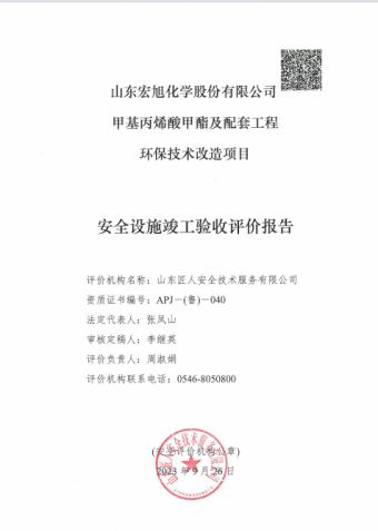 单位名称、项目名称:山东宏旭化学股份有限公司甲基丙烯酸甲酯及配套工程环保技术改造项目安全设施竣工验收评价报告 | |||
