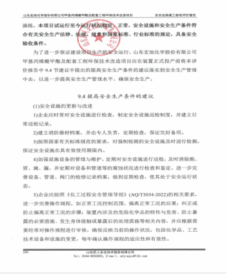 有必要公开的其它内容: 通过安全检查表评价,本次评价共检查了162项,通过检查表法检查发现符合检查要求的有159项,约占总检查项的98.15%;部分不符合检查要求的有3项,约占总检查项的1.85%。企业认同本评价公司提出的对策措施,并进行了整改。 (2)本项目主要存在火灾爆炸、容器爆炸、中毒和窒息、触电、灼烫、高处坠落、机械伤害、物体打击、噪声和振动、起重伤害、粉尘伤害、冻伤、车辆伤害等。其中火灾爆炸、容器爆炸、中毒和窒息为主要危险有害因素。 (3)依据《危险化学品重大危险源辨识》(GB18218-2018)辨识及分级可知,本项目技改后,MMA装置构成四级危险化学品重大危险源,ACH装置构成三级危险化学品重大危险源;SA装置、焚烧炉装置技改前后均未构成危险化学品重大危险源。 (4)由预先危险性分析可知:本项目涉及的火灾爆炸的危险等级为Ⅲ~Ⅳ级;容器爆炸、中毒和窒息的危险等级为Ⅲ~Ⅳ级;灼烫、触电、机械伤害、高处坠落、物体打击、噪声和振动的危险等级为Ⅱ~Ⅲ级。 (5)由危险度评价法可知:塔蒸馏塔再沸器、塔顶前冷却器、塔顶后冷却器、酯化釜、余热锅炉的危险等级均为“Ⅱ级”,中度危险;初馏塔、甲基丙烯酸分离塔、结晶反应器、C2301前冷凝器、C2301中冷凝器、C2301后冷凝器、C2301再沸器、循环热水罐、MMA水分离罐、C2301回流罐、气液分离罐、酸水脱气储罐、结晶反应加热器、母液加热器、预稠器、母液储罐危险等级为Ⅲ,低度危险。 (6)通过模拟分析,结晶反应器反应器大孔泄漏发生中毒事故,最大死亡半径292m,重伤半径410m,轻伤半径550m;事故影响范围覆盖为山东宏旭化学股份有限公司、山东天弘化学有限公司、山东科鲁尔化学有限公司厂区。 本项目遵守了国家对建设项目实施“三同时”制度要求,委托具备相应资质的施工单位按照已经通过审查的安全设施设计进行了施工,质量达到安全设施设计文件要求;设立评价及安全设施设计专篇中的各项安全措施基本落实,未落实项进行了整改;特种设备办理相关的登记注册手续,相关的安全附件、仪器仪表已检验、检测合格,项目建设工程消防验收合格,安全管理可靠、到位,安全生产规章制度健全,事故应急预案符合《生产经营单位生产安全事故应急预案编制导则》(GB/T29639-2020)的要求,并进行了演练。本项目试运行至今运行状况稳定、正常,安全设施和安全生产条件符合有关安全生产法律、法规、规章和国家标准、行业标准的规定,具备安全验收条件。 | |||
