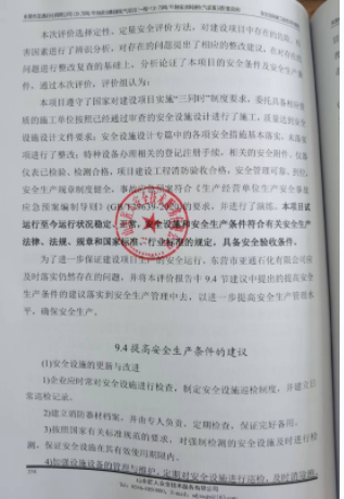 有必要公开的其它内容: 、《危险化学品生产企业安全生产许可证实施办法》(国家安全生产监督管理总局令第41号,总局令第79号及89号修订)等法律、法规、文件的规定要求,本评价组对东营海源化工股份有限公司安全现状评价得出结论如下: ⑴政府规划要求的符合性 海源化工厂区位于东营港化工产业园,东营港化工产业园属于山东省人民政府办公厅公布的第一批化工园区,该园区并经东营市人民政府办公室调整扩大。该公司位于扩大产业园内,并且所在厂区已取得不动产证。建设项目所在地符合当地政府的规划要求。 ⑵周边的安全防火距离评价 厂区附近无风景区和文物古迹,对环境和生态无危害,周边环境符合建厂条件。项目区内无架空电力、通讯线穿过,地下无输油、输气管线穿过。 本项目与厂外周边设施间的防火间距符合《石油化工企业设计防火标准(2018年版)》(GB50160-2008)、《建筑设计防火规范(2018年版)》(GB50016-2014)和《电力设施保护条例》(国务院令第239号,国务院令第588号修订)的相关要求。 根据《危险化学品生产装置和储存设施外部安全防护距离确定方法》(GB/T37243-2019)关于爆炸物、有毒气体、易燃气体的定义可知,本项目不涉及爆炸物、有毒气体;涉及的易燃气体主要有异丁烯。涉及的易燃气体设计量之和与其在GB18218-2018中规定的临界量比值之和大于1,根据GB/T37243-2019第4.3条可知,需采用定量风险评价法确定外部安全防护距离。 本评价采用中国安全生产科学研究院的重大危险源区域定量风险评估软件进行风险模拟分析(具体过程见本报告第3.2.2节)。 根据《危险化学品生产装置和储存设施风险基准》(GB36894-2018)可知,海源化工西南侧的东营科源供热有限公司的车间(100人以下)为一般防护目标中的三类防护目标。本厂区周边500m范围内不涉及高敏感防护目标、重要防护目标、一般防护目标中的一类、二类防护目标。 经过模拟分析,个人风险基准3×10-5次/年的区域范围内不存在《危险化学品生产装置和储存设施风险基准》(GB36894-2018)规定的一般防护目标中的三类防护目标;个人风险基准1×10-5次/年的区域范围内不存在《危险化学品生产装置和储存设施风险基准》(GB36894-2018)规定的一般防护目标中的二类防护目标;个人风险基准3×10-6次/年的区域范围内不存在《危险化学品生产装置和储存设施风险基准》(GB36894-2018)规定的高敏感防护目标、重要防护目标、一般防护目标中的一类防护目标。海源化工社会风险值曲线处于可接受区。 总体评价结论:通过对该系统现场的检查、评价,评价组认为该企业目前在安全管理、外部安全条件、总平面布置、主要装置及设施、储运设施、公用工程等方面符合要求,企业认真落实了8.2章节提出的整改建议,对隐患进行了整改,其目前的安全状态符合法律、法规、标准、规范的要求,具备安全使用条件。 | |||